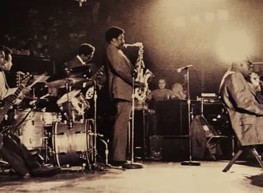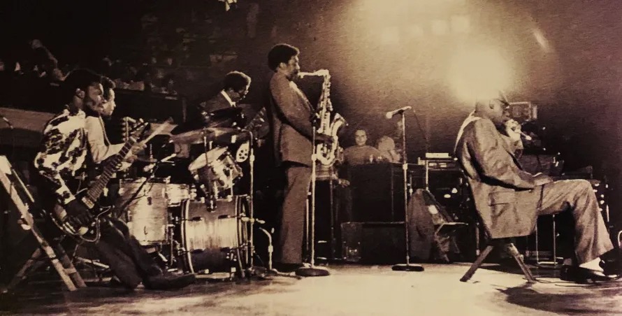 Howlin’ Wolf’s last band! Left to right: Shorty Gilbert, Chico Chism, Hubert Sumlin, Eddie Shaw, Howlin’ Wolf! Also in the band but likely obscured by Wolf was Detroit Junior. This photo was taken at Chicago’s International Amphitheater in November 1975 and Wolf passed on January 10, 1976.